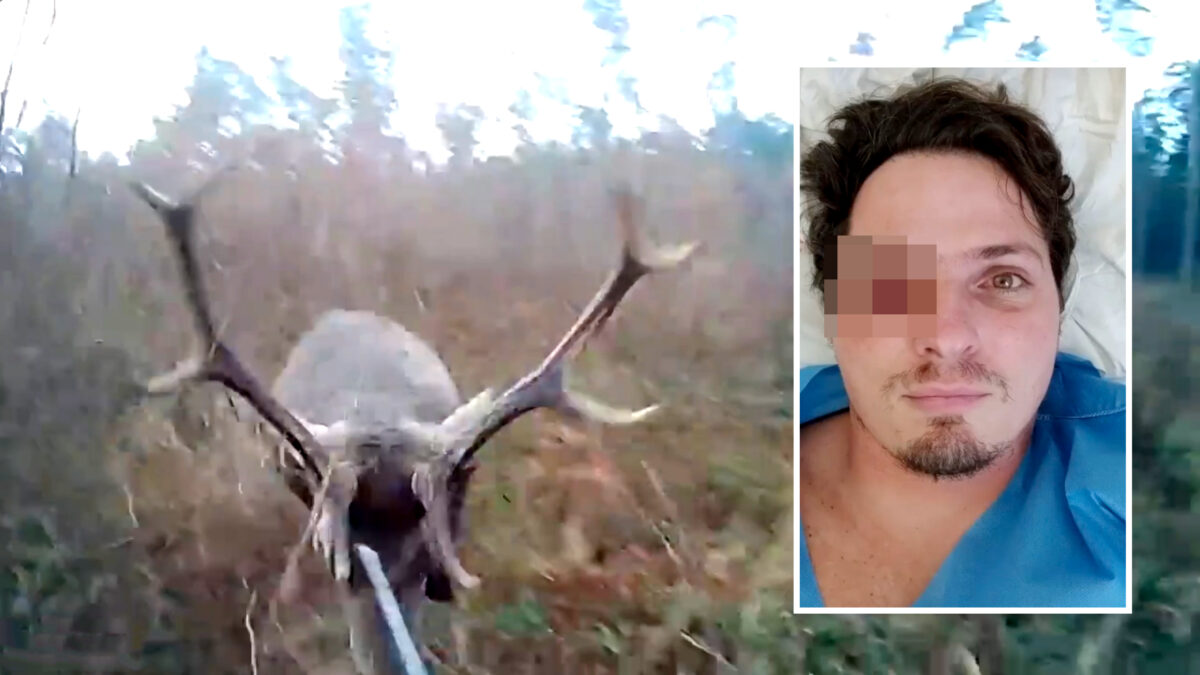 Hert gaat vol in de aanval en beukt met zijn gewei vol op de oogkas van een jager