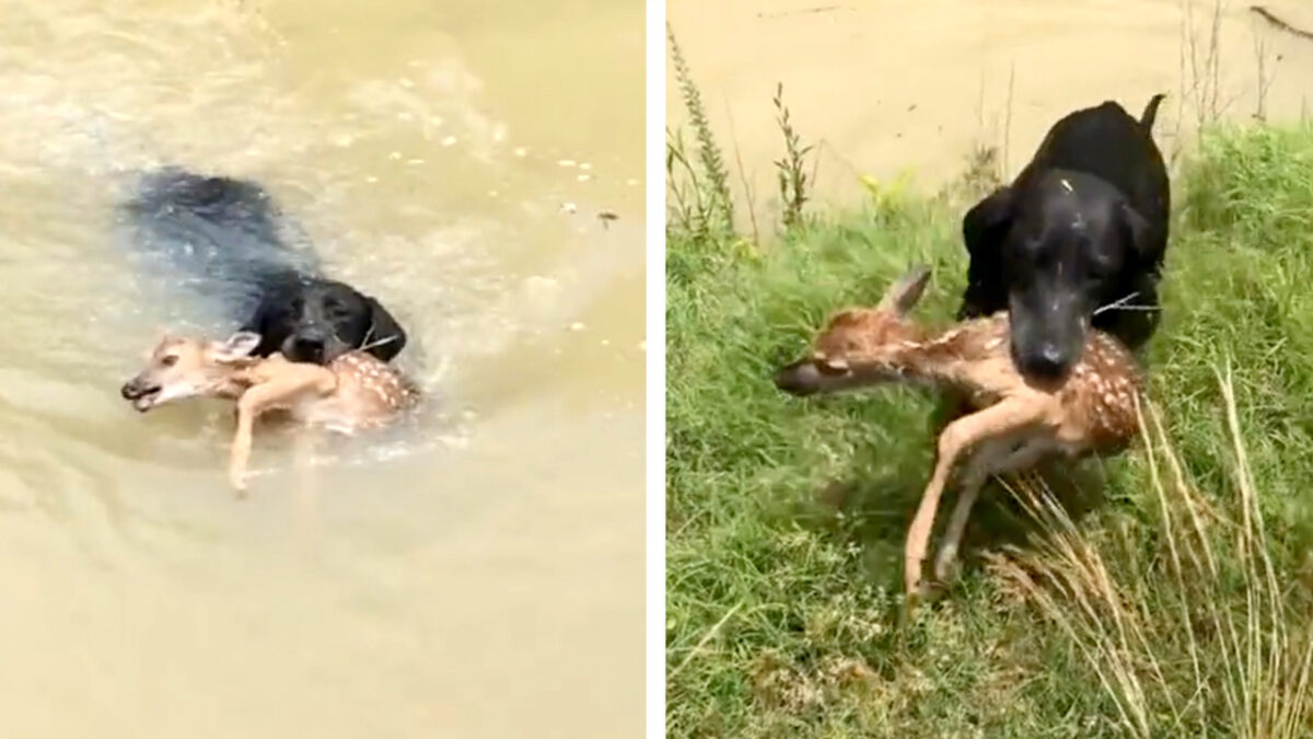 Awww. Hond redt jong hertje dat in het water is beland Dieren