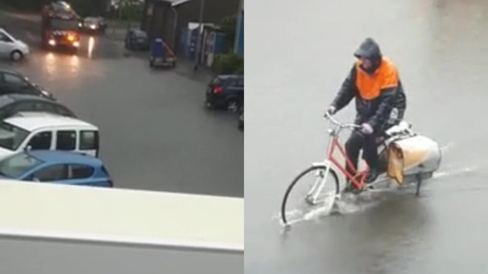 "Baas, ik blijf vandaag thuis want het druppelt een beetje en dan wordt mijn haar nat." Nee, niks van dat alles, deze knakker snapt gewoon dat post bezorgd hoort te worden. Keurig!