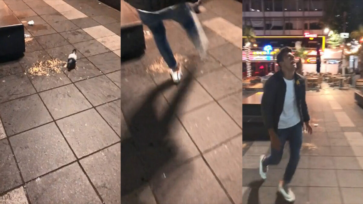 Heerlijke karma voor gast die kots etende duif probeert te trappen