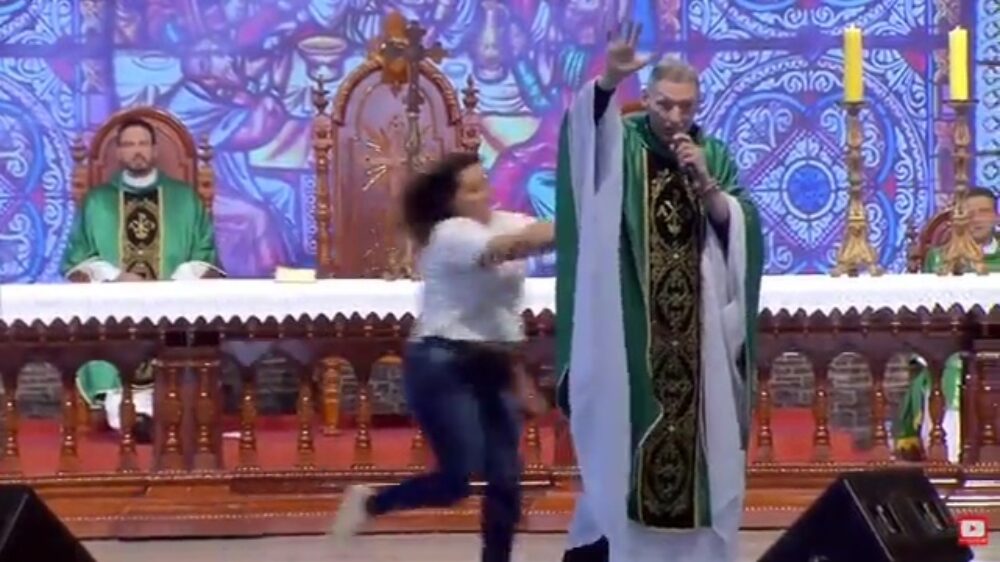 Priester maakt tijdens mis een onvrijwillige stagedive