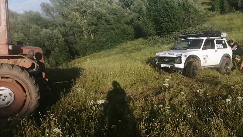 Behulpzame boeren halen vastgelopen Lada uit zjin benarde positie