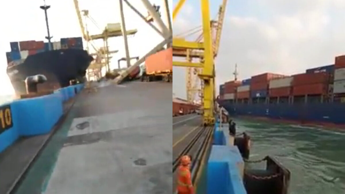 Vrachtschip crasht tegen kade en sloopt een enorme kraan