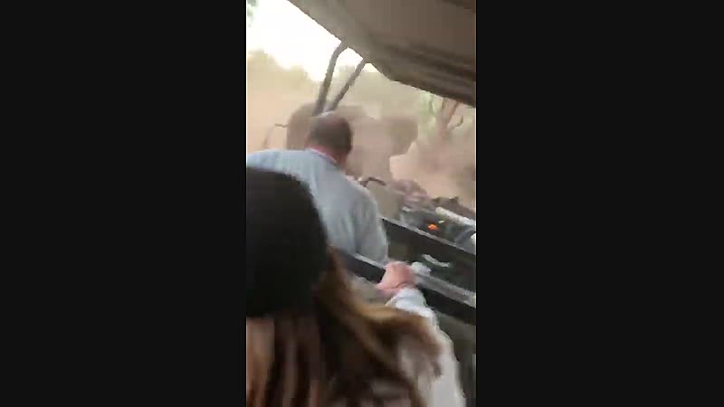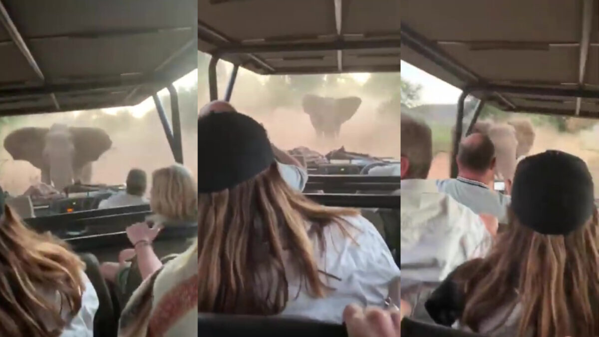 Olifant gaat in Kruger Park vol in de T-Rex modus en valt busje vol toeristen aan