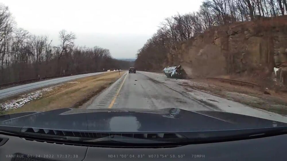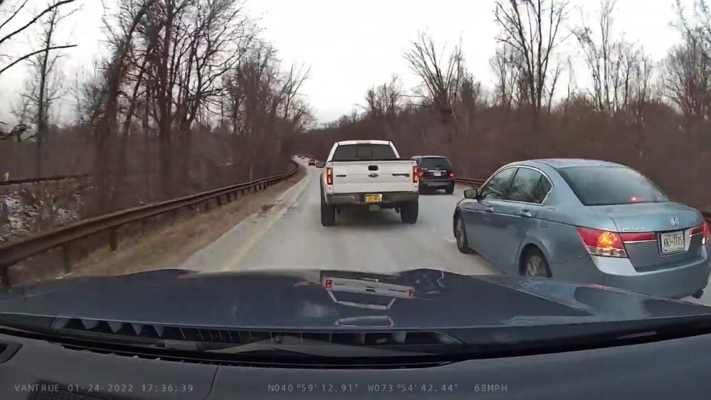Het is niet duidelijk wat eraan voorafging, maar beide bestuurders zijn elkaar behoorlijk aan het uitdagen. Als hij de pick-up uiteindelijk rechts inhaalt verliest hij de macht over het stuur en maakt 'ie een harde klapper. Karma?