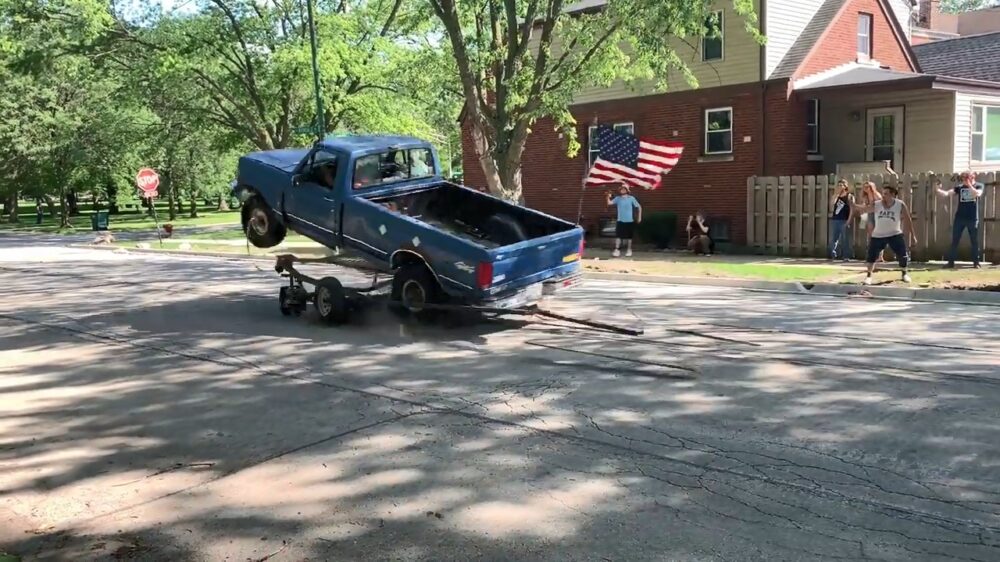 Redneck kan na jump met zijn pickup-truck meteen door naar de stort