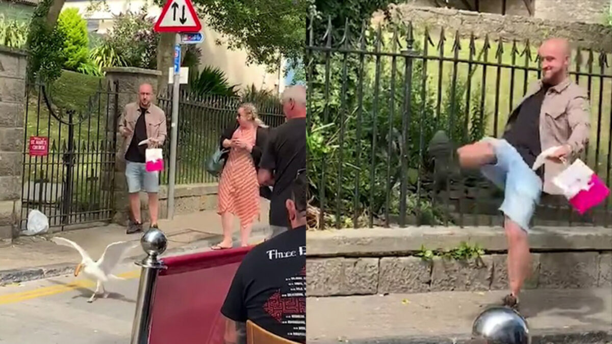 Sluwe zeemeeuw wacht op perfecte moment om braadworst te jatten