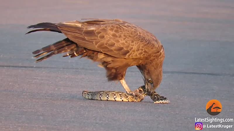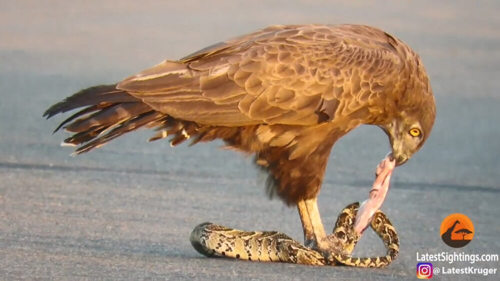 De zeer giftige pofadder heeft geen schijn van kans tegen de bruine slangenarend. Wat een mietje.