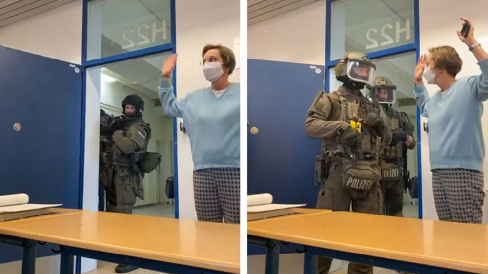 Er duiken nu beelden op vanuit een klaslokaal, waarin iedereen ogenschijnlijk rustig zit terwijl een zwaarbewapend team ME'ers de boel komt checken.