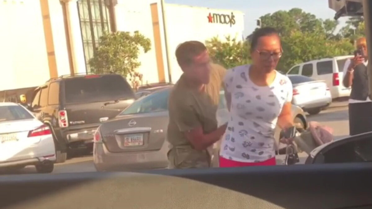 Soldaat gaat compleet in de flipmode tegen een paar vrouwen op een parkeerplaats