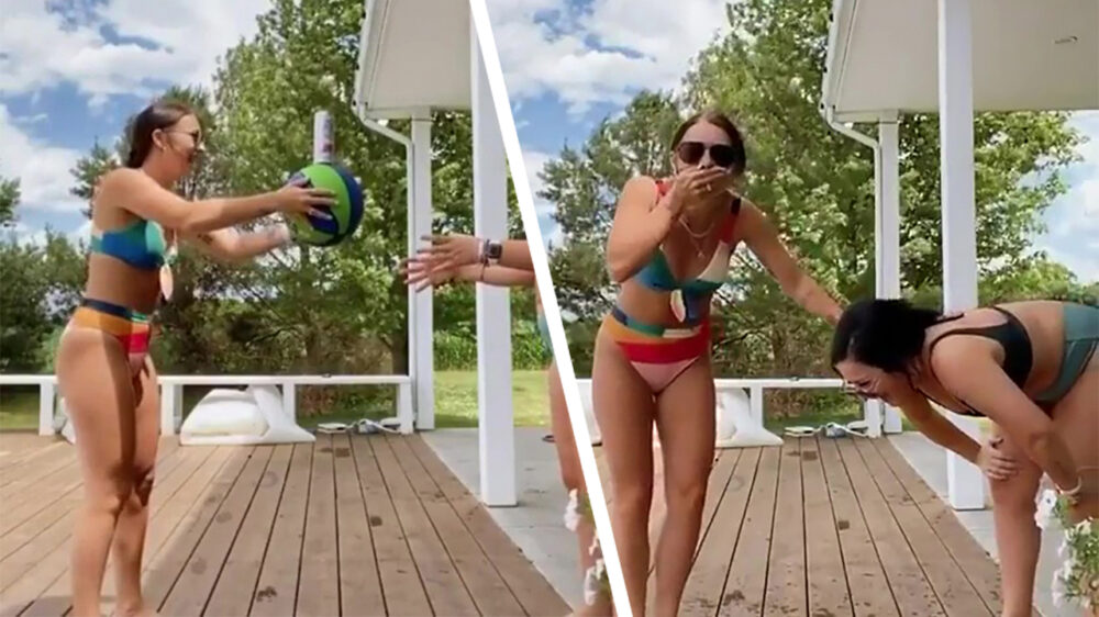 Vriendinnen proberen 't trucje met een basketbal en een blikje bier