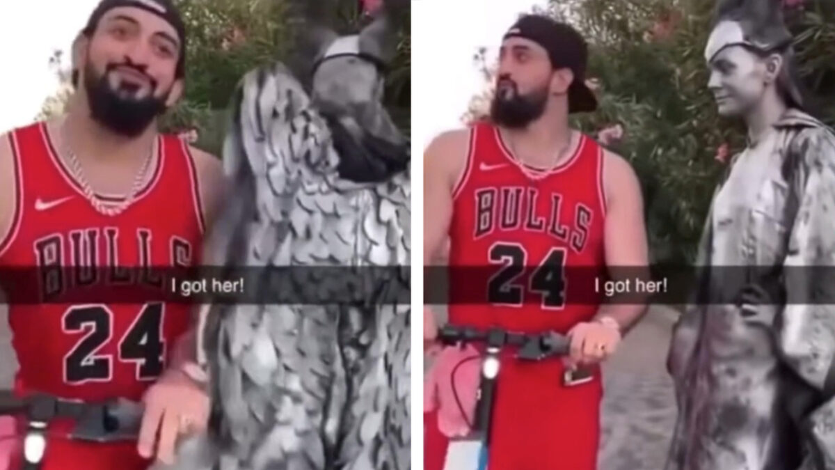 Grapjas trollt levend standbeeld met de ouderwetse "Toot 'n Scoot"