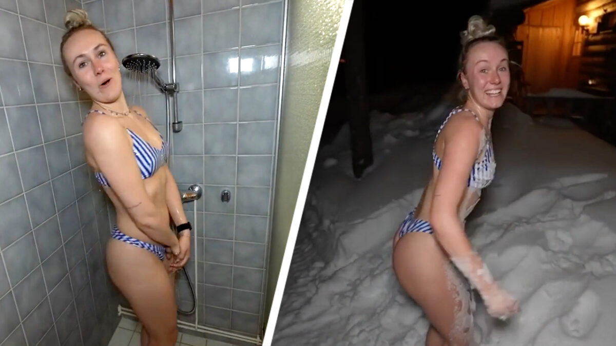 Myron Koops, de vriendin van Enzo Knol, neemt een ijskoude sneeuwduik in Lapland