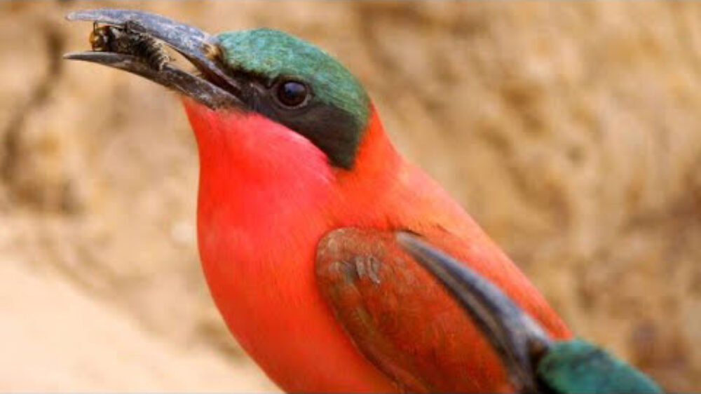 Vogel ramt de angel uit een bij voordat 'ie hem opeet