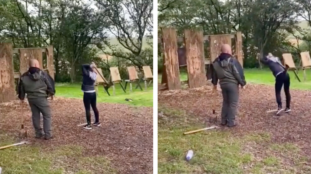 Vrouw trakteert zichzelf bijna op een tweede naad tijdens het bijlwerpen Fails