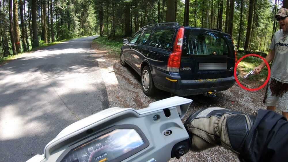 De flapdrol op zijn blije motorscooter is duidelijk op zoek naar een bestuurder die ook maar iets fout doet. Don't bring a knife egg to a gunfight...