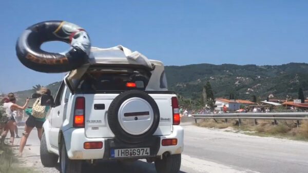 Leuk zeg, om de achterklep van je gehuurde auto terug te vouwen. Vakantieman gezellig hè.