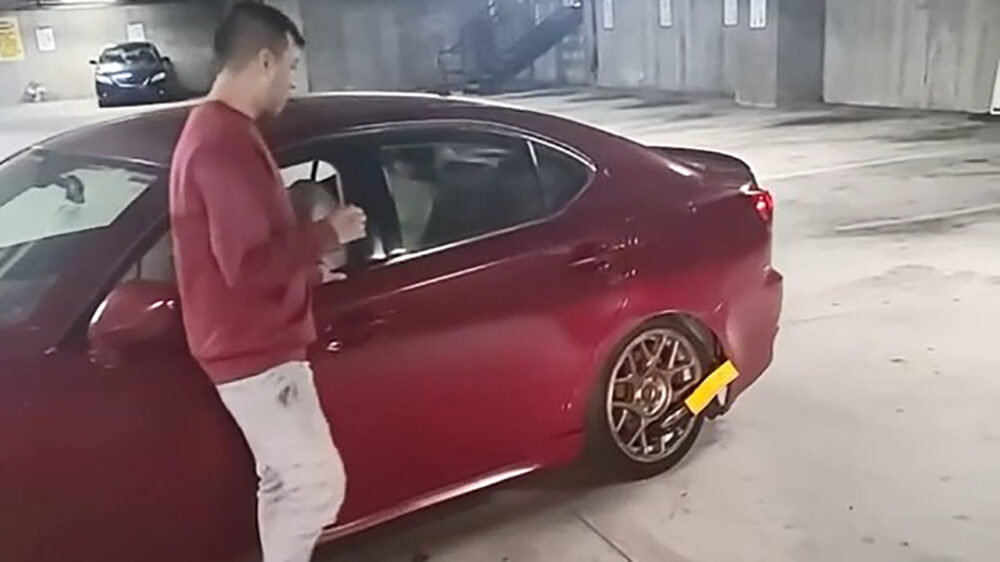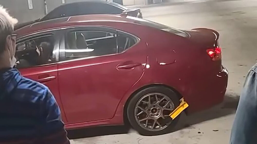 Juffie demonstreert hoe je je auto met een wielklem aan gort rijdt