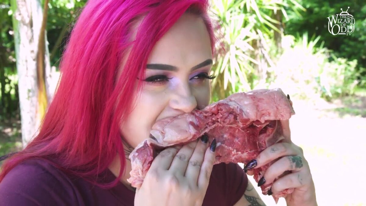 Nee viespeuken, we hebben het hier over een écht stuk vlees. Nu eten wij het meeste vlees ook het liefst medium rare, maar deze dame doet de moeite niet eens om haar lapje even aan te bakken. Gewoon zo uit de verpakking en knagen maar. Smakelijk!