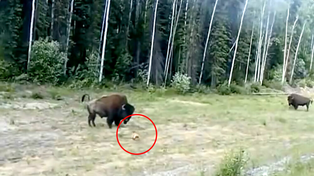 Iets te overmoedige pitbull terriër wil flinke kopstoot aan bizon uitdelen
