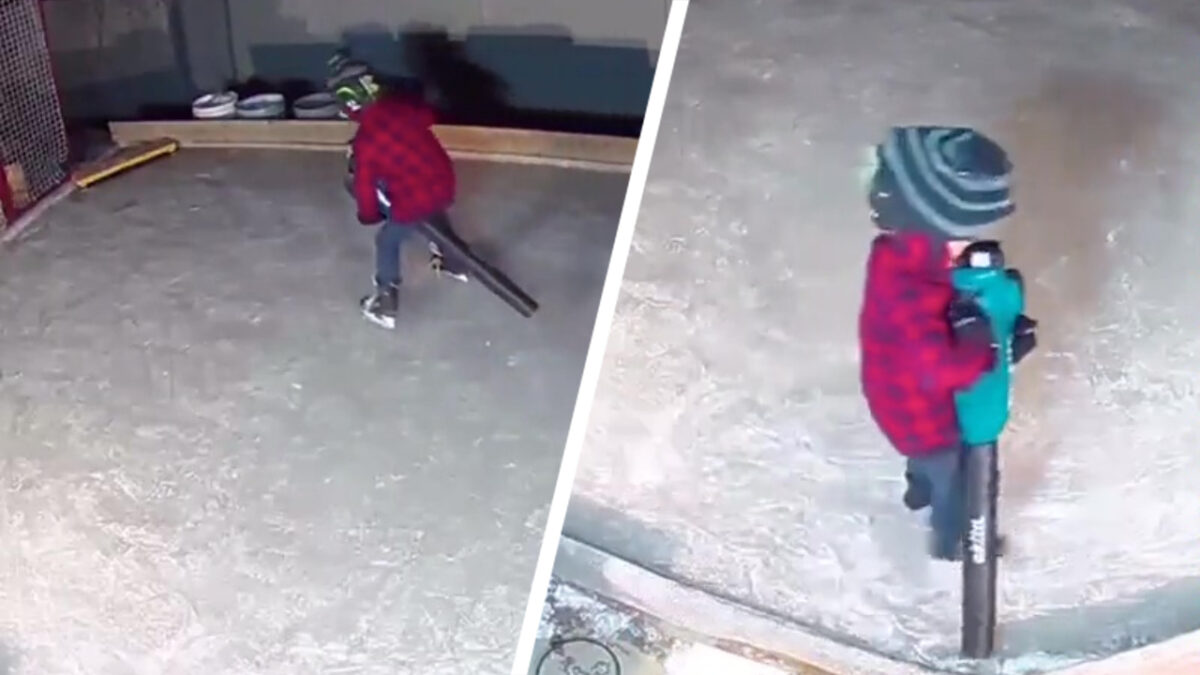 Schaatsende koter heeft de dag van zijn leven met een bladblazer
