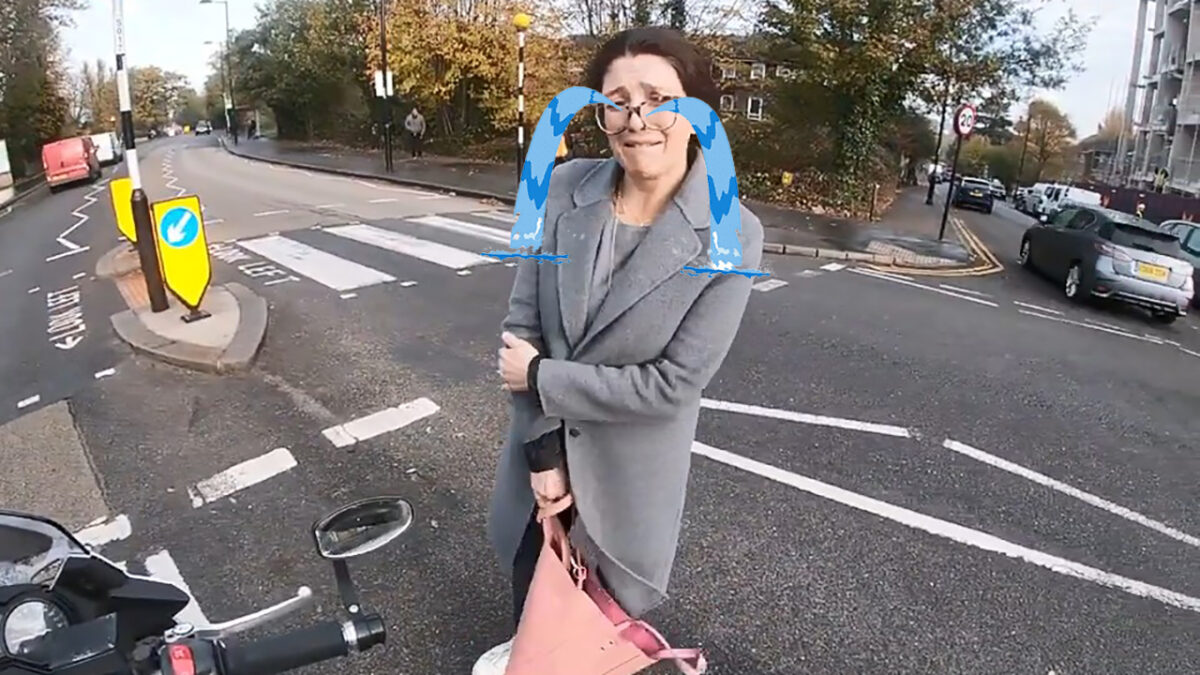 Motorrijder tikt 'zielige' vrouw aan die zonder te kijken rustig oversteekt