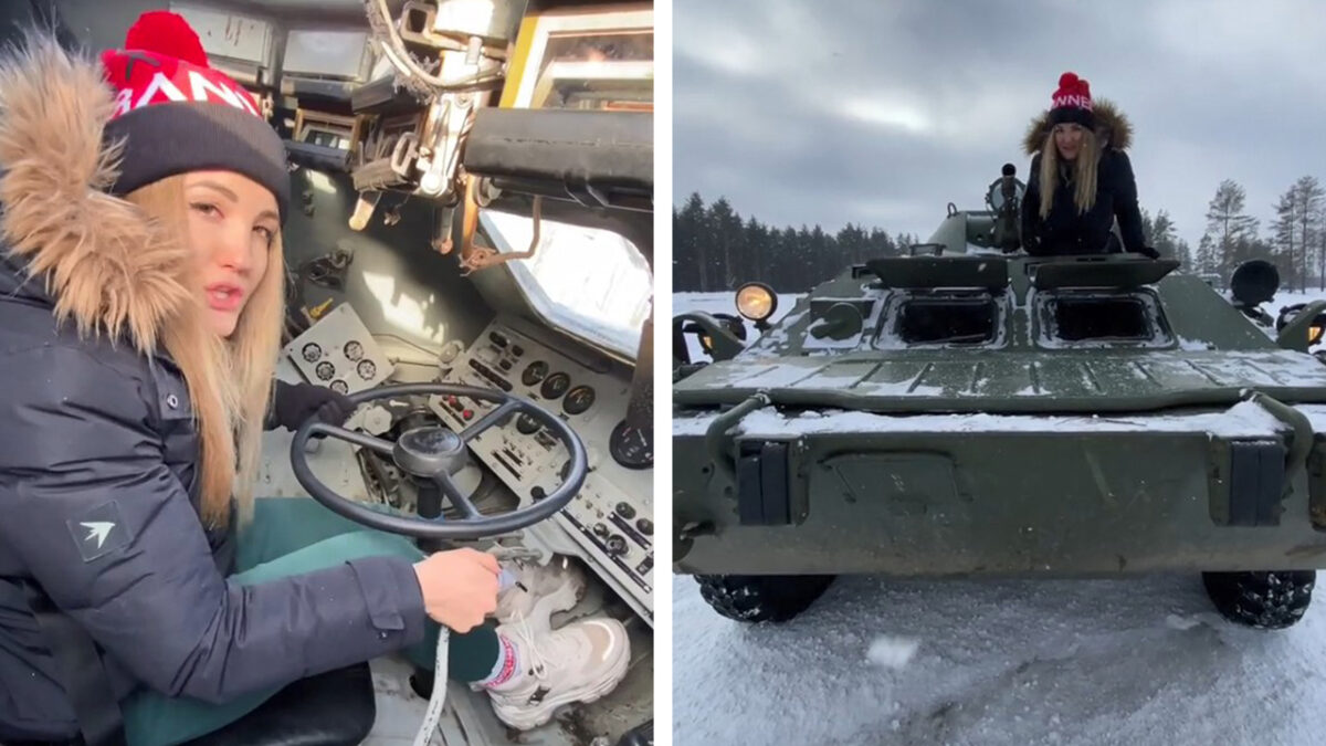 Influencer Nastya Tuman laat zien hoe je een verlaten Russische pantserwagen bestuurt