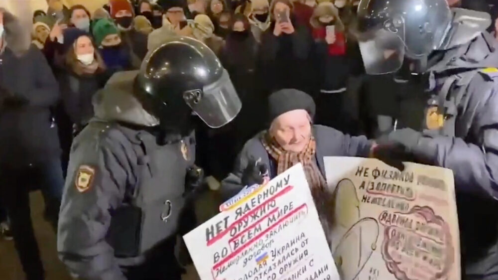 De naam Yelena Osipova zal je waarschijnlijk weinig belletjes doen rinkelen, maar deze activiste draait al een tijdje mee. Sterker nog, ze overleefde de belegering van Leningrad tussen 1941 en 1944 door Duitsland tijdens de Tweede Wereldoorlog. Oké, als baby, maar toch. Ze spreekt zich nu hardop uit tegen de acties van Poetin, maar het feit dat ze inmiddels 77 jaar oud is deed de Russische ME in St. Petersburg weinig: meekomen zul je.