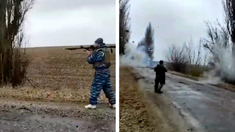 Oekraïense burgers vallen Russische pantservoertuigen met raketwerpers aan
