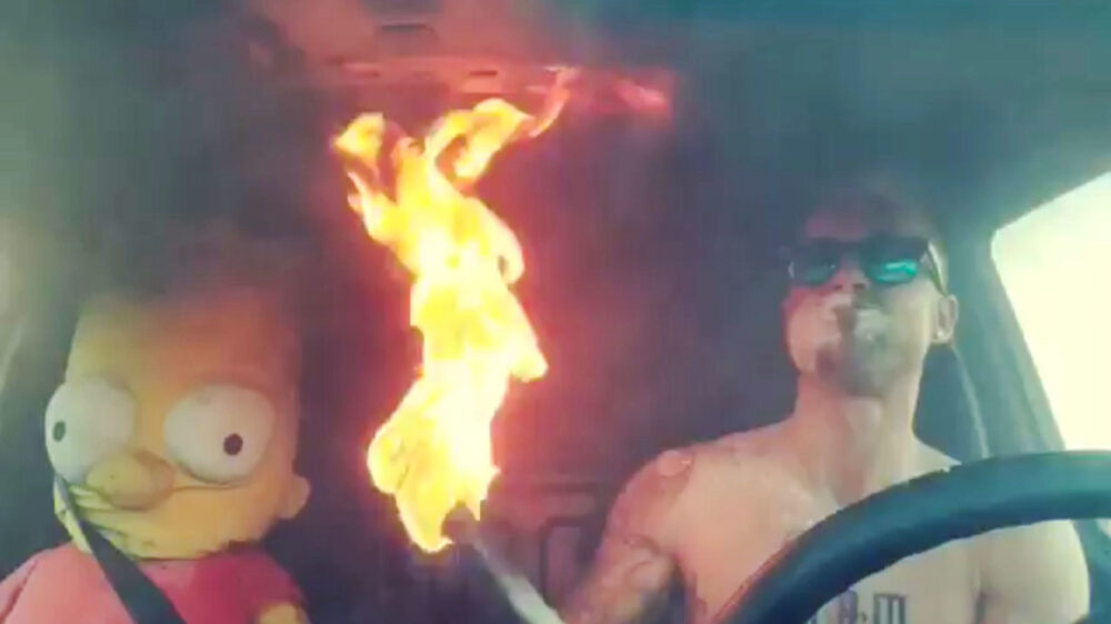 Feestbeest gaat in zijn auto los met fakkels en vuurwerk