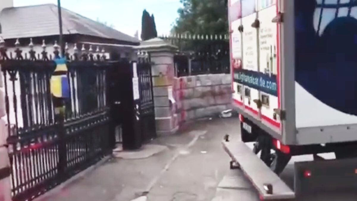 Ierse vrachtwagenchauffeur is helemaal klaar met Rusland en besluit de Russische ambassade te beuken