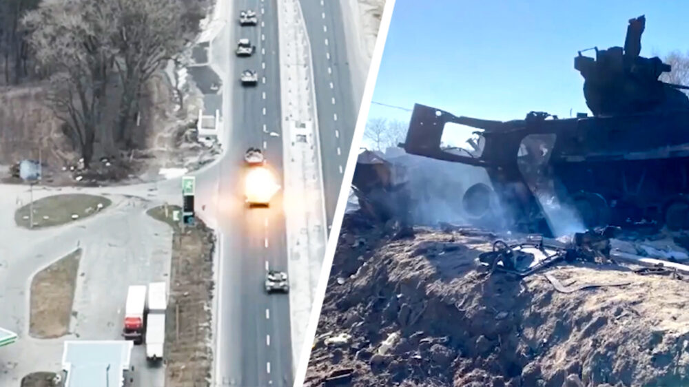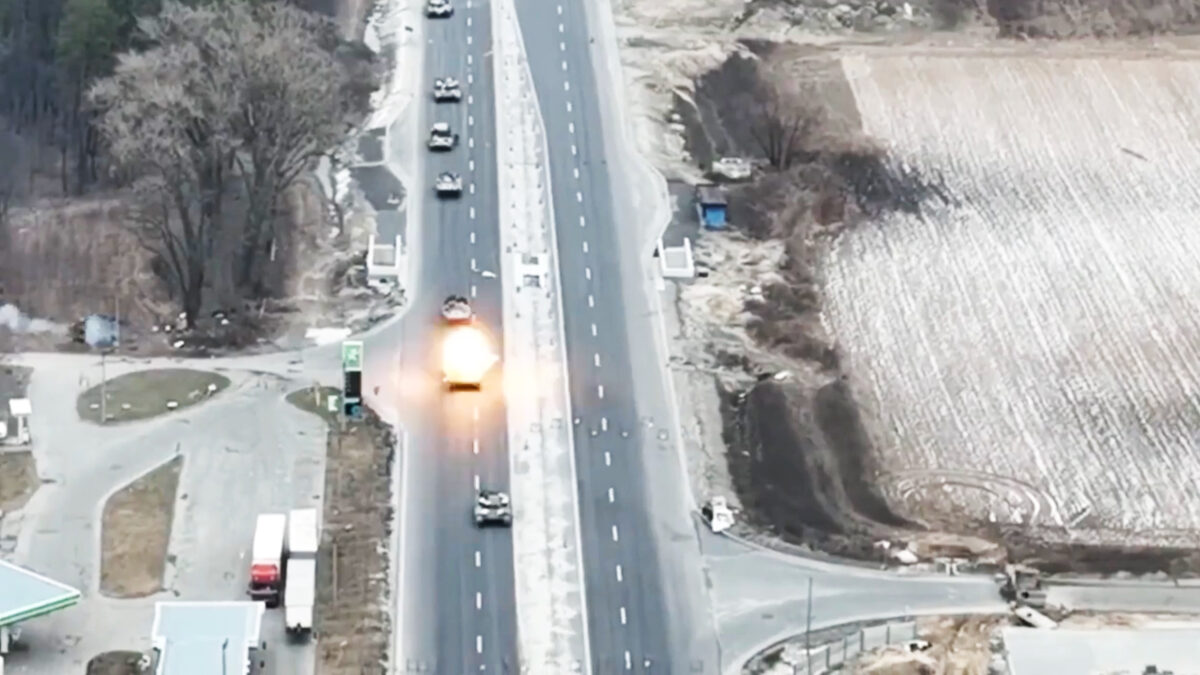 Nieuwe dronevideo van een Russisch konvooi dat in een Oekraïense hinderlaag rijdt