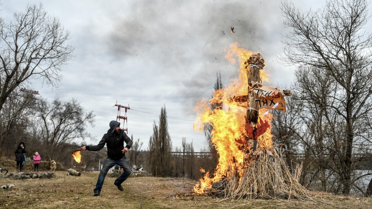 Een Oekraïense man gooit een molotovcocktail naar een beeltenis van Vladimir Poetin in het Sahaidachnoho-ravijn in het zuidoosten van Oekraïne.