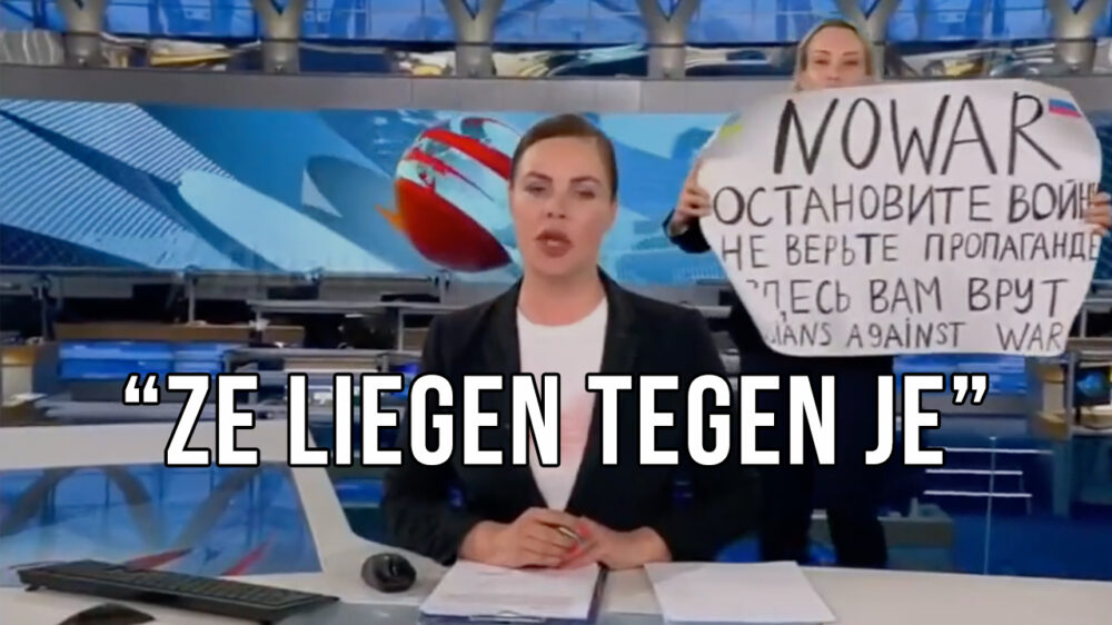 Dat demonstreren in Rusland op dit moment niet echt wordt gewaardeerd heb je afgelopen dagen al kunnen zien, maar gisteravond was er ook op de Russische staatstelevisie een zeldzaam moment waarbij een tv-medewerkster in een live-uitzending een bord ophield met daarop de tekst: "Stop de oorlog! Geloof niet in propaganda! Ze liegen tegen je!".