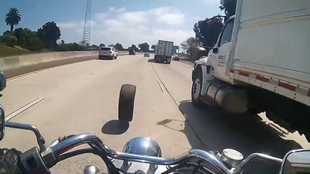 Volgens de motorrijder is de autoband bewust door een of andere idioot van de heuvel gegooid waarna 'ie zo de snelweg oprolt. Op de video is dit niet te zien, maar hij komt er ogenschijnlijk toch redelijk ongeschonden vanaf.