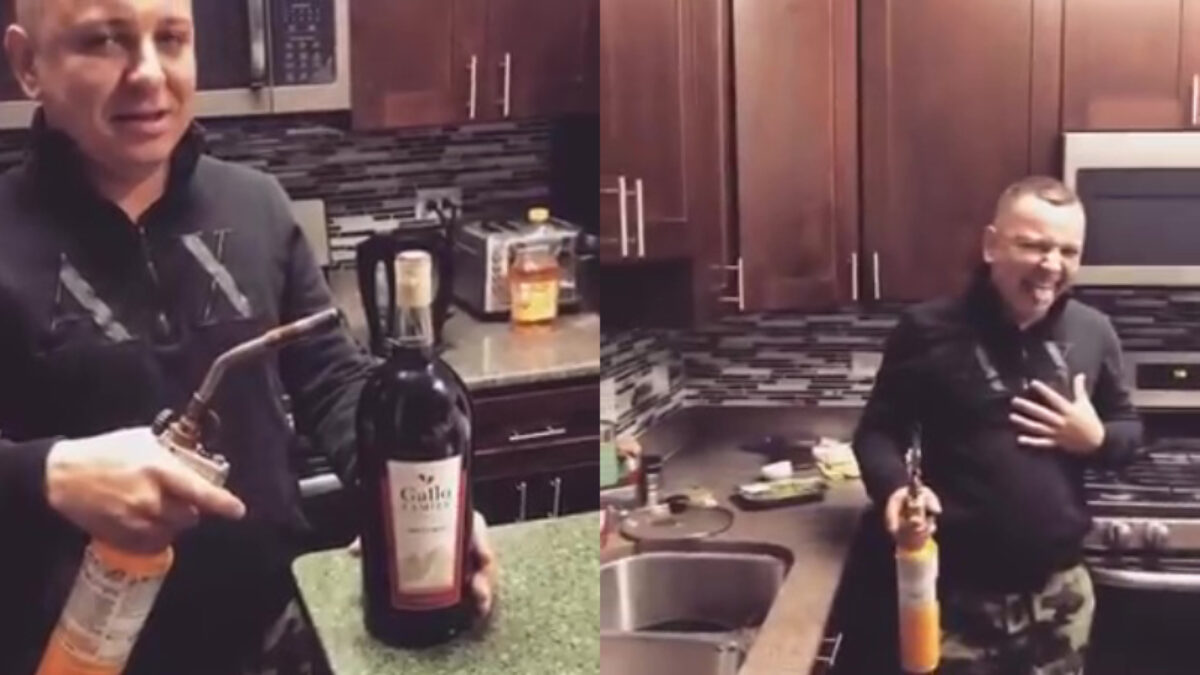 Je hebt vast wel eens gelezen dat je een wijnfles open kunt maken door een vlam op de hals te zetten, maar dat dat niet altijd het slimste idee is blijkt vandaag wel weer.