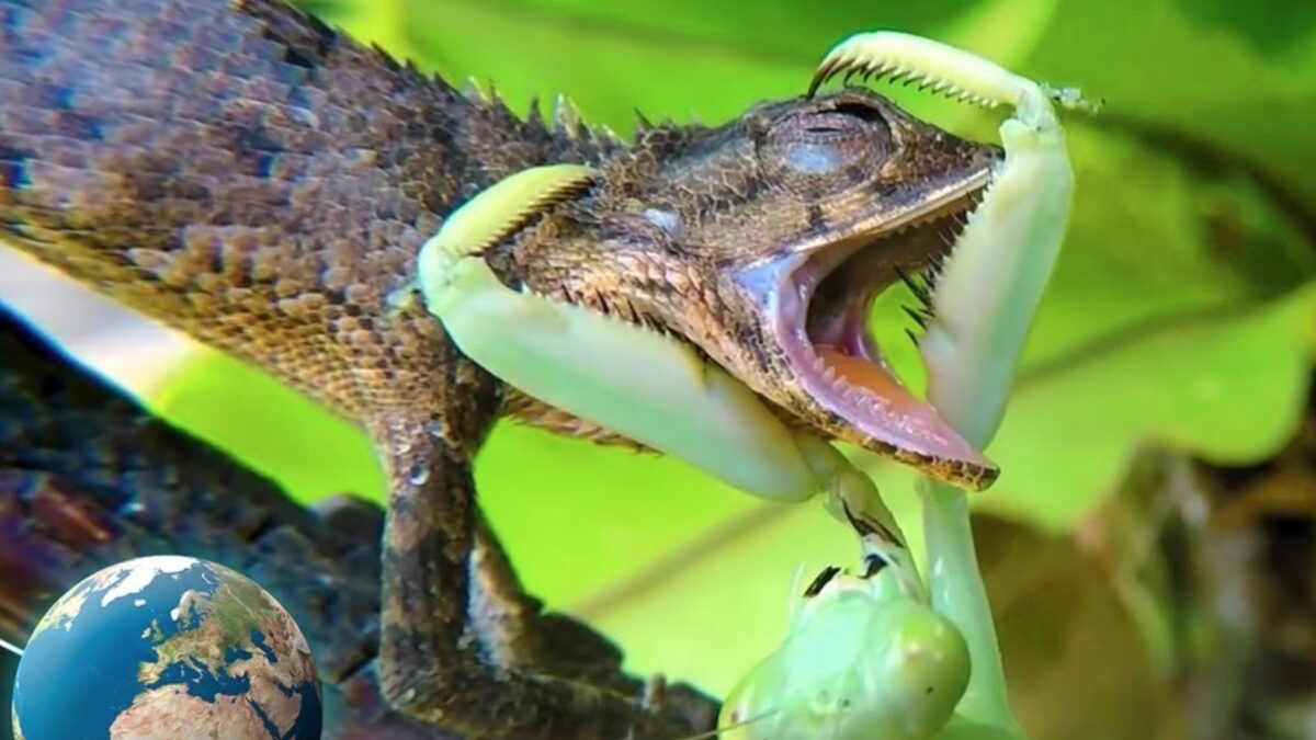 Bidsprinkhaan verslindt deze iets te sappige gekko levend Documentaire
