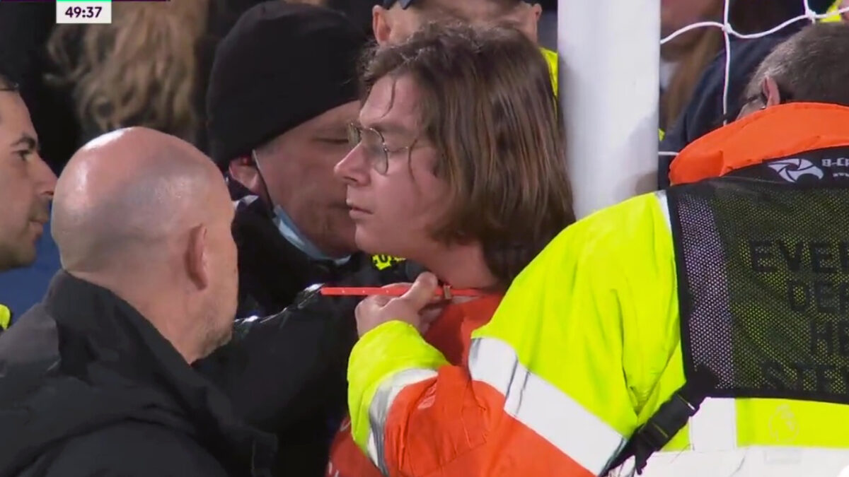 Na vijf minuten is de man bevrijd en van het veld gedragen door beveiligers 👀#ZiggoSport #PremierLeague #EVENEW pic.twitter.com/Wq16jxscn8