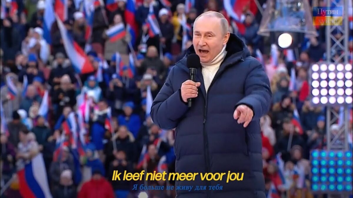 Niet eerder vertoonde beelden laten zien hoe Poetin voor tienduizenden Russen een nummer van Marco Borsato in het Luzhniki Stadion in Moskou zingt tijdens de viering van de annexatie van de Krim. Haters zullen zeggen dat het fake is, maar we weten ondertussen allemaal dat ze daar in Rusland niet aan doen.