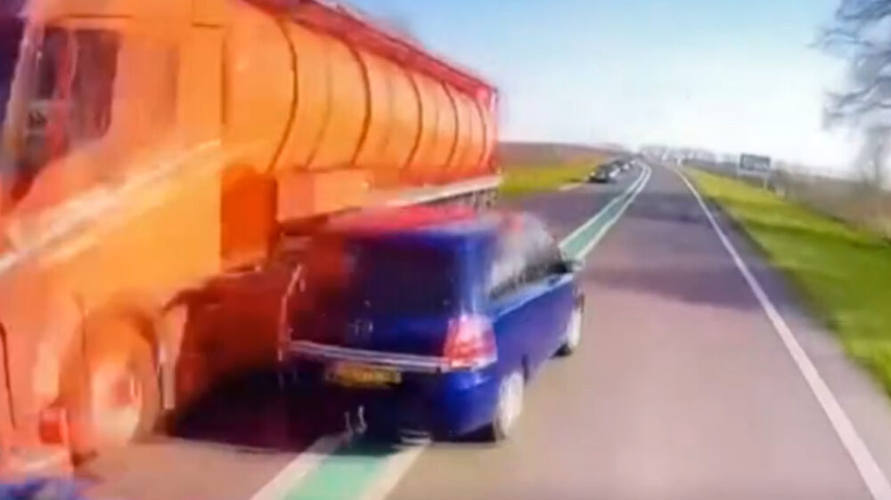 Natuurlijk is het best frustrerend om achter een trage vrachtwagen klem te zitten, maar die dubbele doorgetrokken streep zou toch een indicatie moeten zijn dat je beter gewoon even kunt blijven hangen. Dat deed deze automobilist op de N34 ter hoogte van Borger niet, en hij mag verdomde blij zijn dat hij dit nog na kan vertellen.