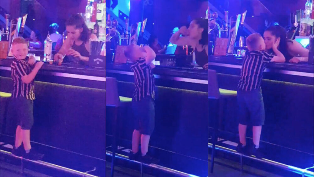 Verlegen 7-jarig jochie krijgt zijn eerste shotje én zijn eerste kusje van de barvrouw