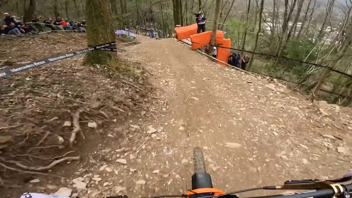 Amaury Pierron stort zich op zijn MTB van een compleet geschift parcours af