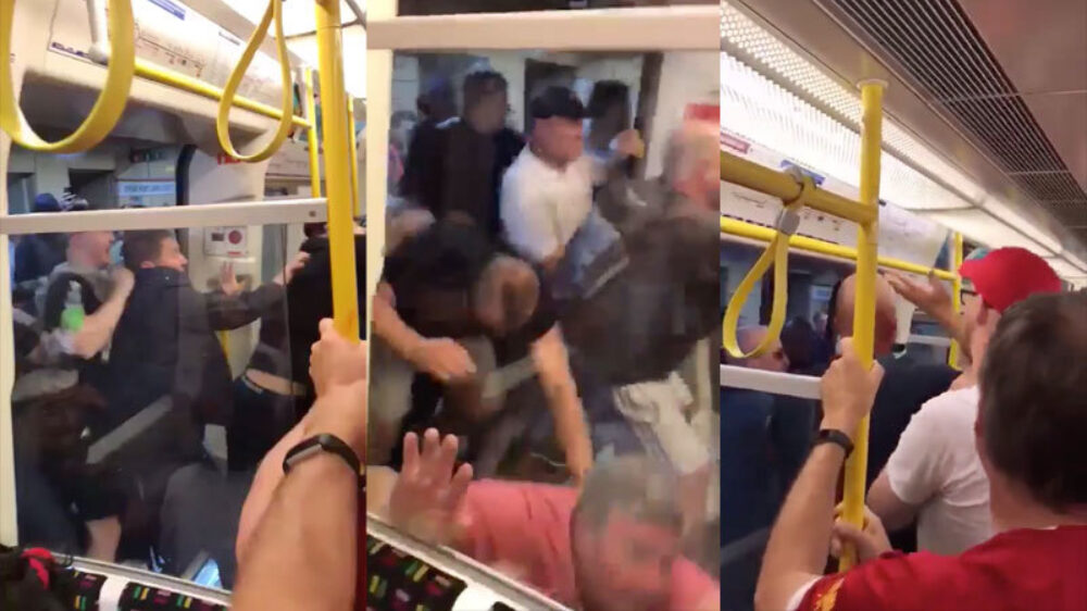 Hooligans van Liverpool en Manchester City discussiëren over voetbaltactieken in het openbaar vervoer Knokken