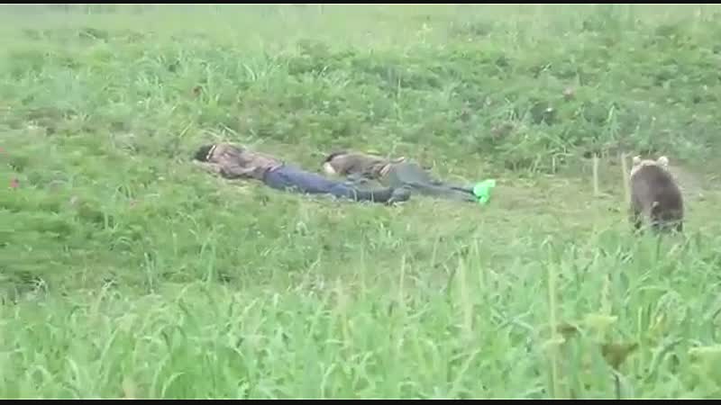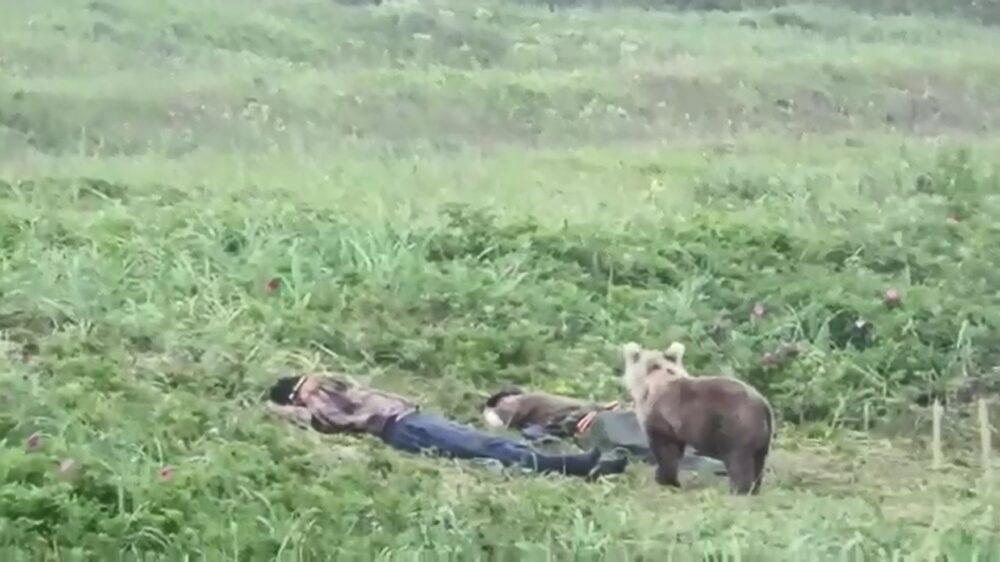 Nieuwsgierige beer maakt twee Russische kameradski's wakker