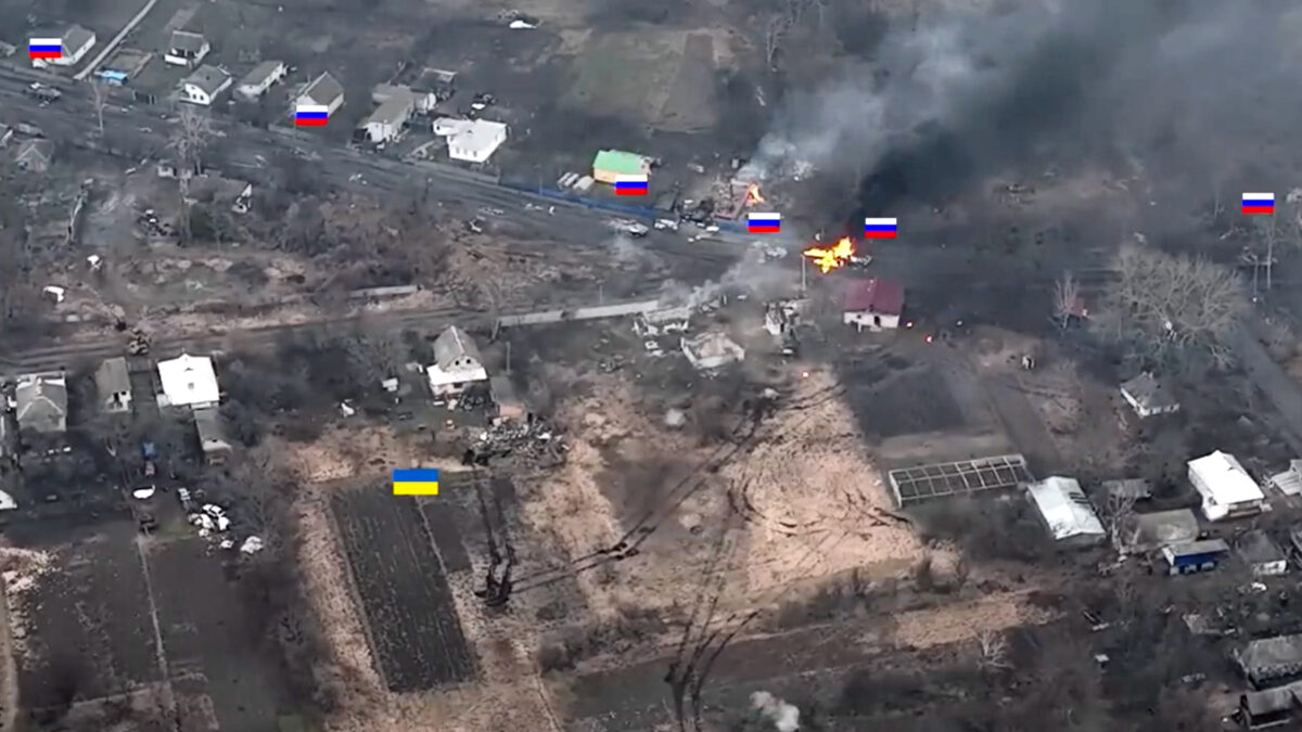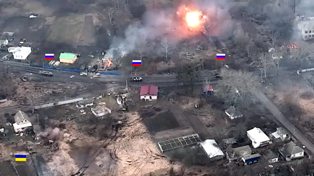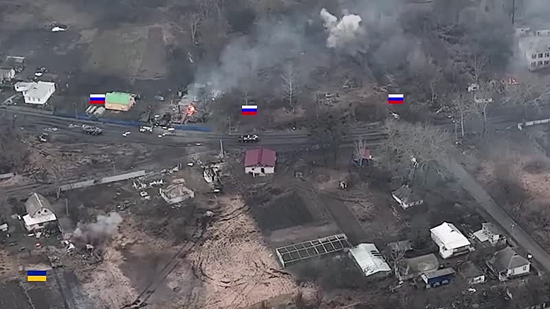 Beelden van een eenzame Oekraïense tank die een Russische gepantserde colonne in een hinderlaag lokt en onder vuur neemt. Deze tank dwingt het convooi zich terug te trekken, waarna het vervolgens door Oekraïens artillerievuur wordt bestookt.
