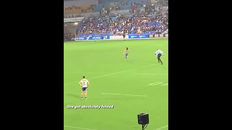 De video van de Australische Javon Johanson, die tijdens een rugbywedstrijd besloot d'r shirt uit te trekken en het veld op te rennen, gaat momenteel vrij hard rond. Niet per se omdat ze al streakend het veld over gaat, maar vooral omdat de steward haar met een heerlijke tackle neerhaalt.