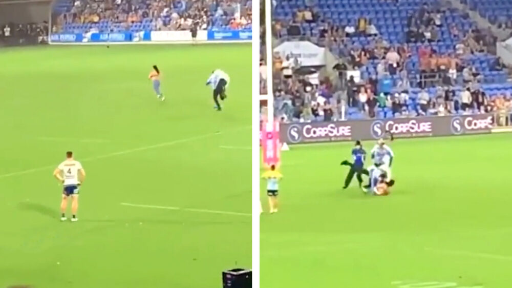 Vrouwelijke streaker wordt door beveiliger dubbelgevouwen nadat ze het veld op rent