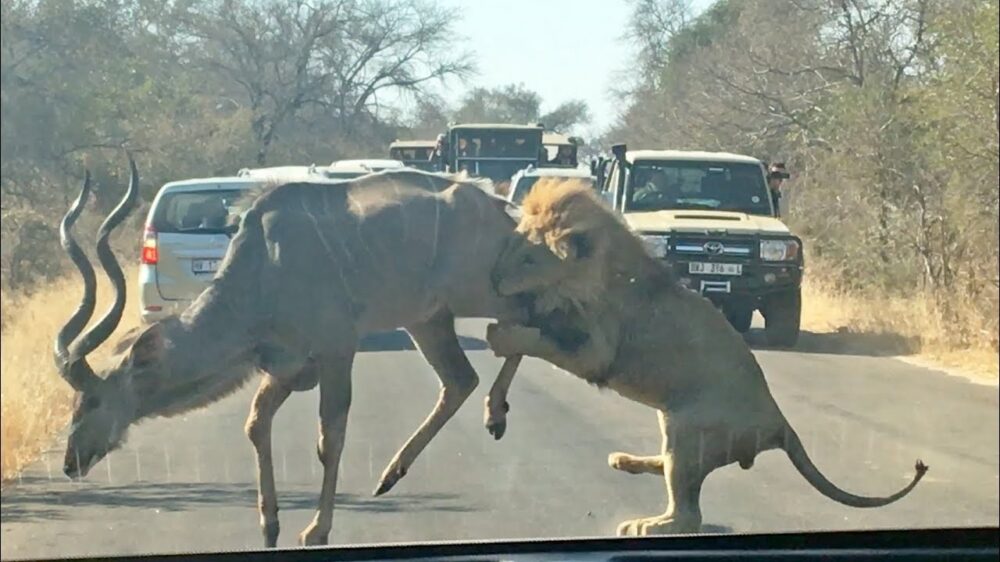 Leeuw slingert asociaal overstekende koedoe op de bon