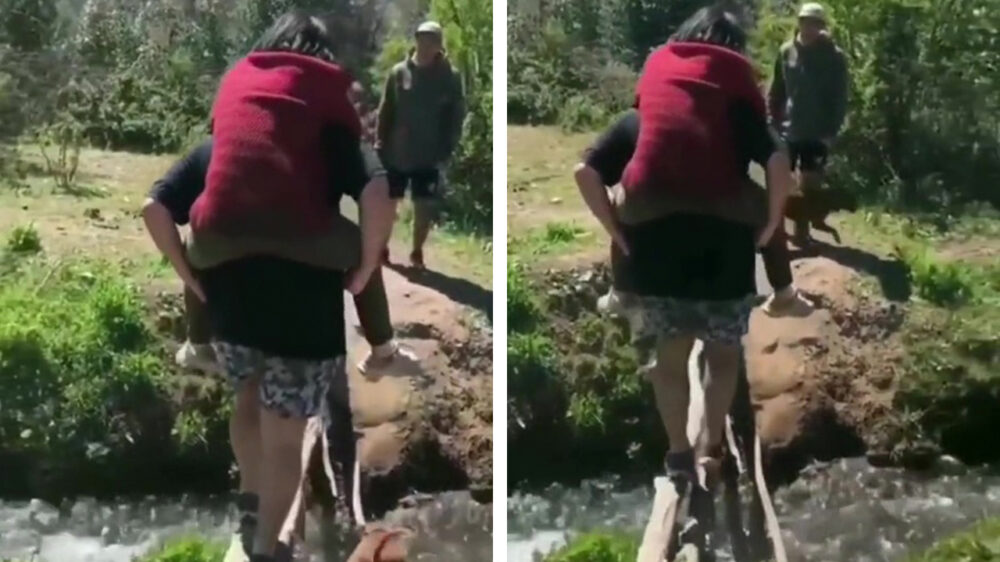 Hoffelijke heer helpt jonkvrouw veilig naar de overkant