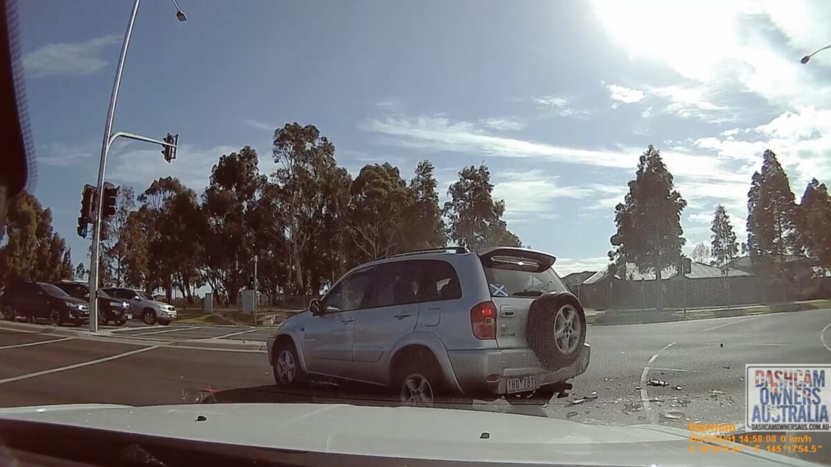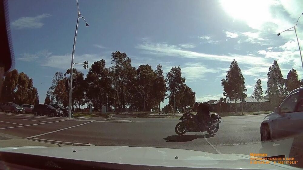 Twee motorrijders janken door rood in het Australische, Cranbourne Victoria. Eéntje heeft net geluk, maar de ander wat minder. Met een luide poffer knalt hij tegen een 4WD, vliegt door de lucht en zijn schoen wordt naar New Zeeland geschoten. Wees gerust, hij kan het navertellen en heeft zijn lesje geleerd. Hopelijk.
